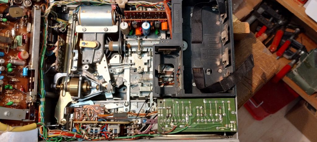 Mittlereweile ist der Antrieb mit Motor schon wieder funktionstüchtig, ich habe einige Kondensatoren – sie hatten alle einen Kurzschluß – ausgewechselt und nun muss ich noch Aufnahme und Wiedergabe zum Laufen bekommen. Jetzt geht auch schon die Wiedergabe und man kann auch teilweise auf einem Stereo-Kanal aufnehmen.